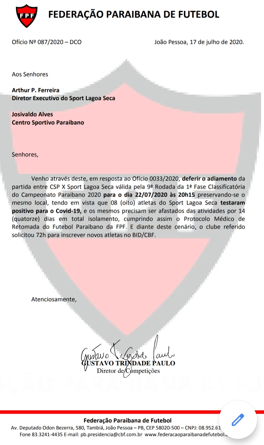 A partida entre CSP x Sport Lagoa Seca não será realizada mais neste sábado (18) por conta que oito atletas do Carneiro do Agreste testaram positivo para o covid-19. A FPF já oficializou o adiamento por de documento. Confira: